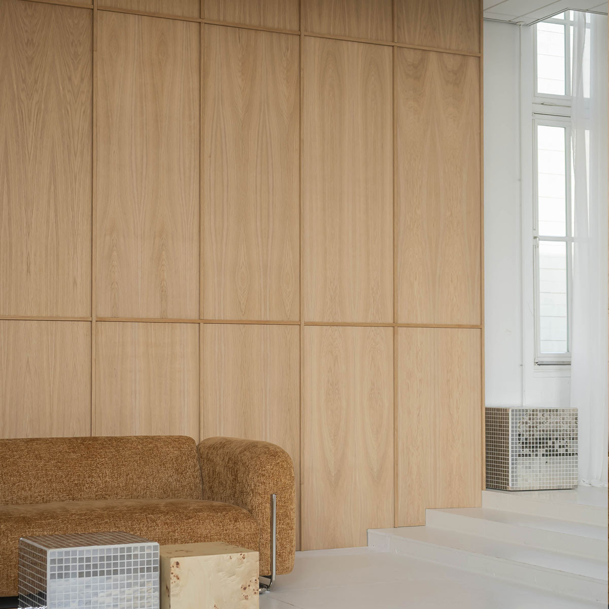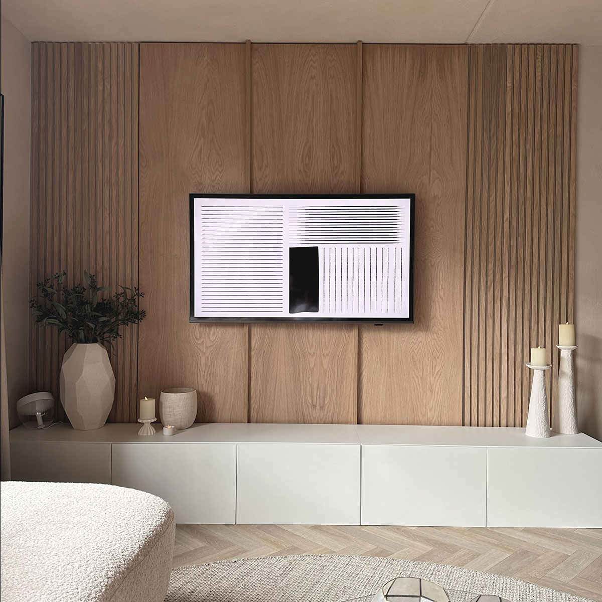 De vlakke wandpanelen in natuurlijk eiken passen perfect in een rustig en Scandinavisch interieur. Het hout zorgt voor een harmonieuze en zachte aankleding. Het brengt de natuur in huis. Iets waar deze woonstijl om bekend staat. De panelen geven een minimalistisch en ruimtelijke uiterlijk aan de ruimte. De panelen zullen voor een stijlvolle woonkamer zorgen waar je helemaal tot rust gaat komen! Het natuurlijk eiken laat zich makkelijk combineren met andere houtsoorten zoals walnoot!